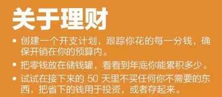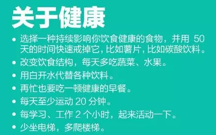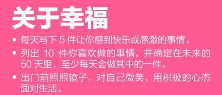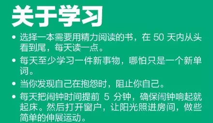 ①堅(jiān)持閱讀,選本好書,每天讀一點(diǎn);②每天至少學(xué)習(xí)一件新事物,哪怕只是一個新單詞;③創(chuàng)建開支計(jì)劃,確保開銷在預(yù)算內(nèi);④確定你經(jīng)常浪費(fèi)時間的5件事,縮短花在這些事上的時間;⑤選擇一種持續(xù)影響你飲食健康的食物,逐漸戒掉。35個小改變,讓你的生活變得不一樣!