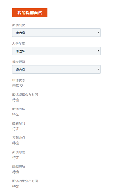 成功申請后,頁面會有對話框彈出;該頁面刷新以后,可以看到您已經(jīng)申請的面試批次、入學(xué)年度、報考班別、申請狀態(tài)(為“已提交”),并看到相應(yīng)批次的面試資格公布時間以及面試結(jié)果公布時間。