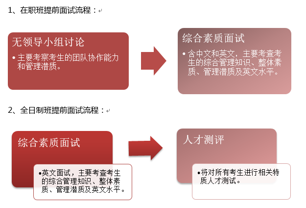 2016年,我院將繼續(xù)全面實行提前面試的招生方式。即:有意報考我院MBA的申請人在聯(lián)考報名之前提交申請材料,通過綜合素質(zhì)面試取得預(yù)錄取資格后,參加全國聯(lián)考成績達到國家A類線并且符合中山大學(xué)研究生錄取條件,即可獲得錄取資格。